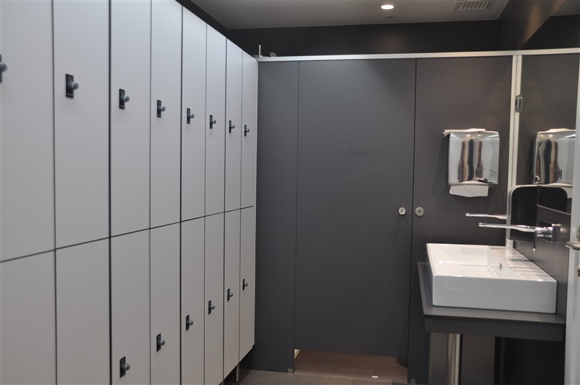 Mobelmol ha equipat els nous vestuaris amb cabines sanitàries, taquilles de vestuari, bancs, penjadors, encimeneres i revestiments de parets. S’han fabricat i instal·lat taquilles TF2 construïdes totalment amb placa de resines fenòliques de 10 mm de gruix en color blanc. Equipades amb frontisses d’acer inoxidable, panys de poliamida amb tancaments de relliscada i peus graduables d’acer inoxidable. Les cabines de dutxa i WC, de color gris fosc en contrast amb les taquilles i revestiment, són del model i-525 combinant acer inoxidable i alumini. En els vestuaris s’ha dissenyat i fabricat un moble penjat de la paret amb portes basculants per allotjar calçat a conjunt amb les taquilles.