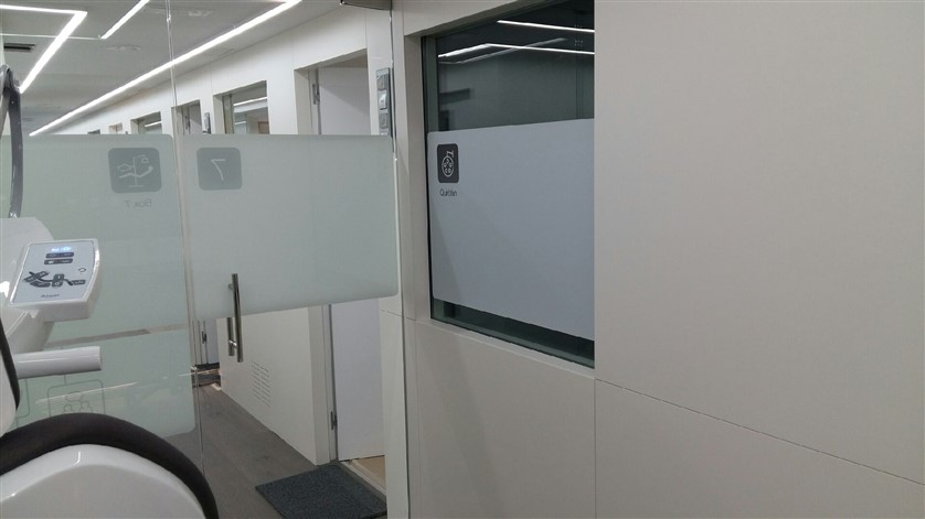 D’altra banda, s’han revestit tots els gabinets i quiròfans, nou en total, amb placa de resines de color blanc amb tot el nucli també blanc. Aquest tipus de material té la característica que passen gairebé desapercebudes i no es veu les línies negres en les juntes de l’H.P.L. També s’ha revestit tot el passadís i els batents de portes i vidres. Si bé aquesta és una solució amb un preu més elevat que l’estàndard, resulta molt aconsellable en llocs com a clíniques on la neteja és una necessitat primordial.