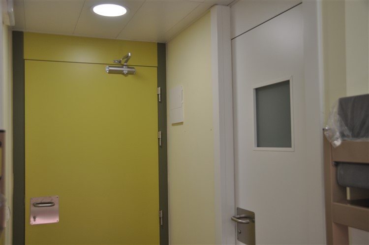 Les portes d’entrada a les habitacions son del material Ei2-60, resistents al foc i estan construïdes amb revestiment H.P.L. del mateix color verd que les cabines i els taulells. El marc és d’acer lacat i estan fabricades a la mateix altura del passadís amb fulla de 2000mm d’altura i fix superior de 700mm. Amb maneta i pany antipànic homologat. Les portes d’entrada als banys són de color blanc amb espiell de vidre laminat translúcid i marc d’alumini extensible de lacat blanc.