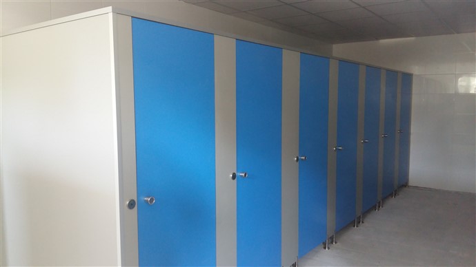 La placa, en ambdós casos, és una placa de resines fenòliques (H.P.L.), de 12 mm de gruix. Els peus són graduables d’acer inoxidable, així com les frontisses, el pom tirador i el tancament amb indicador lliure-ocupat amb desbloqueig d’emergència. Els perfils en “U” d per subjecció de panells entre si i amb les parets amb d’alumini anoditzat en plata mat.