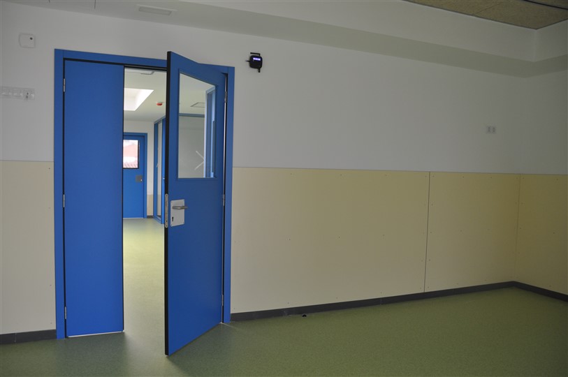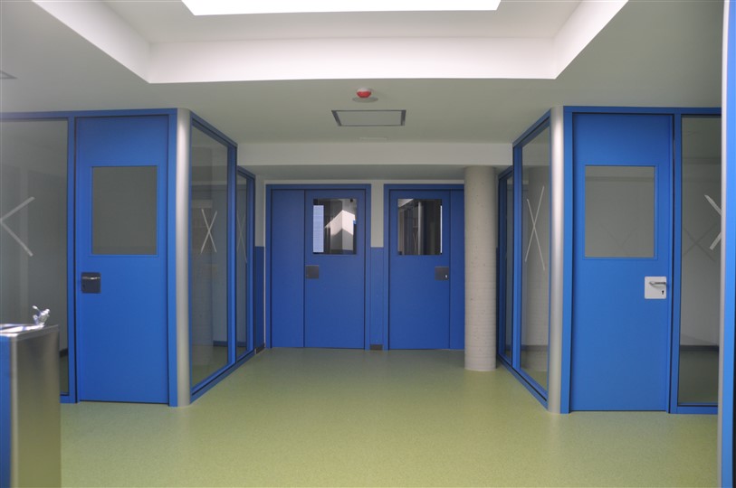 Se han fabricado e instalado todas las puertas de entrada a aulas, talleres, aseos y oficinas. Se trata de puertas compact con marco taco revestido. Las hojas se construyen a base de placa de resinas fenólicas de 3 mm por cada cara, bastidor perimetral también de resinas fenólicas y rellenas de espuma de poliestireno. Los premarcos van revestidos con batientes y tapetas de placa de resinas fenólicas de 10mm de espesor del mismo color que las puertas. Para formar la zona de oficinas se han fabricado mamparas de pino revestidas también con placa H.P.L. con puertas integradas y acristaladas con vidrio laminado 5+5 también suministrado por Mobelmol.